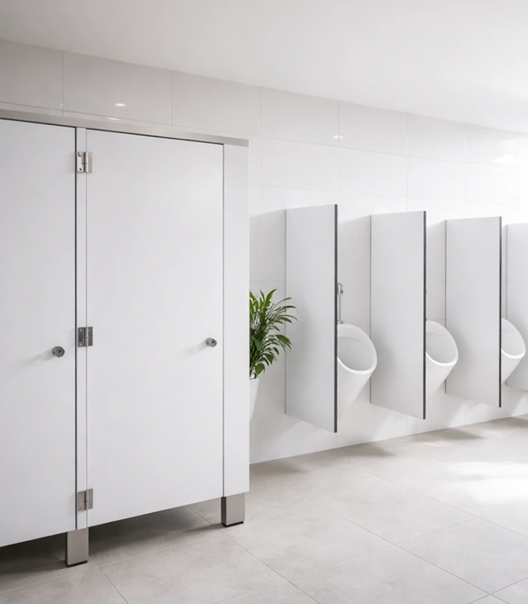 Divisiones sanitarias, cabinas y mobiliario HPL para espacios de alto tráfico, higiene y fácil mantenimiento.